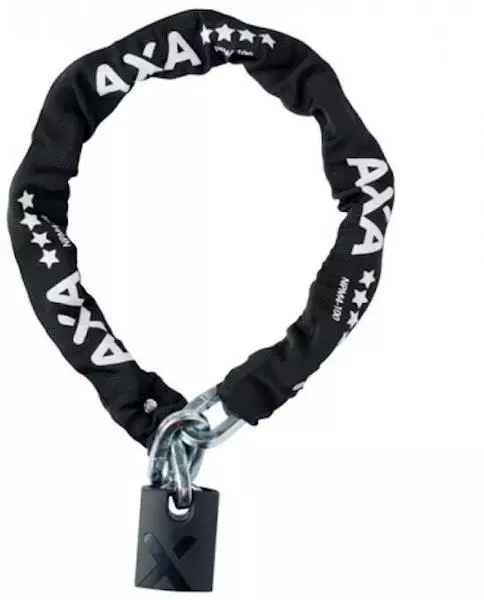 Kædelås fra AXA. Kæden er dækket af neopren. Længde 130 cm. Sikkehedsniveau 20. Hængelåsen er lavet i forstærket stål med cylinder, der ikke kan bores ud.
