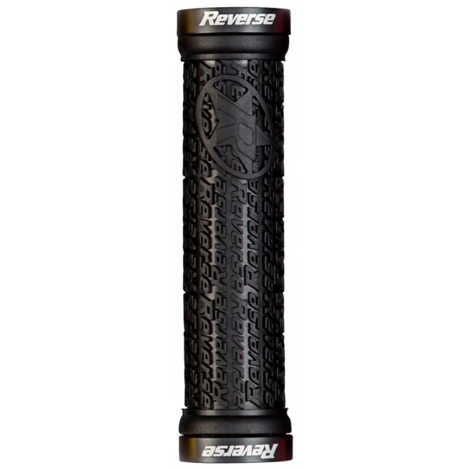 Lækre håndtag fra Reverse. Sort midte i gummi og sort ydrekanter i aluminium, inderdel i plastik. Spændes i begge ender.