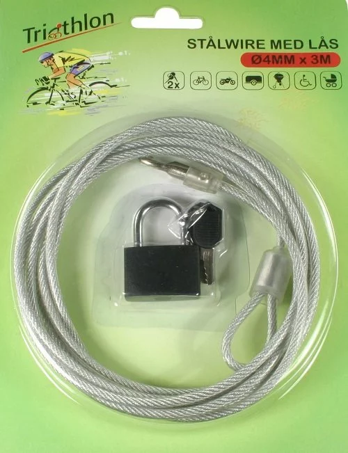 Wire med tilhørende hængelås. Wiren er 4 mm. x 300 cm. i længden og kan bruges til at låse både cykler, barnevogne mm. fast.